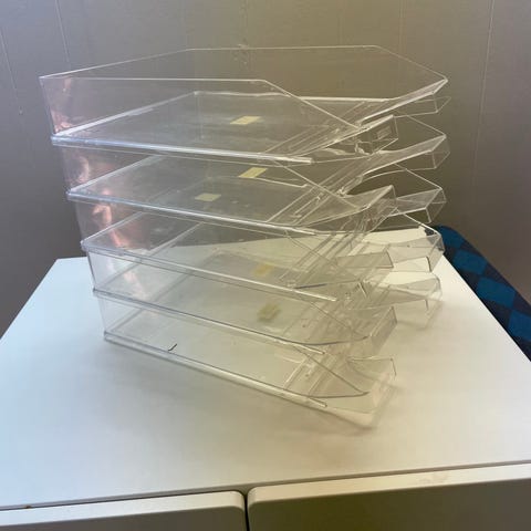 Sæt med to dokumentbakker i plast i farverne sort og hvid. Bakkerne er rektangulære og beregnet til opbevaring og sortering af papir og dokumenter på skrivebord eller hylde. Overfladen har riller, som hjælper med at holde indholdet på plads. Velegnet til kontor, hjemmearbejdsplads eller studie til organisering af løse papirer.