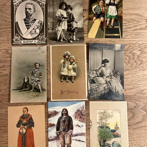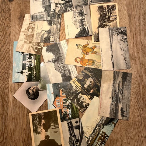 Blandet parti gamle postkort med dyremotiver. Motiverne omfatter blandt andet hunde, heste, kyllinger og haner. Flere af kortene er håndskrevne og stemplede på bagsiden og frimærker.