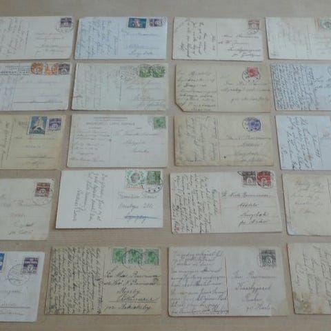 Samling af blandede ældre postkort med forskellige danske motiver. Motiverne omfatter blandt andet bygninger, parker, kyst- og søområder samt promenade- og badeanlægsbilleder. Postkortene fremstår i overvejende sort-hvid og sepia nuancer, nogle med håndskrift eller trykt tekst på forsiden.og frimærker