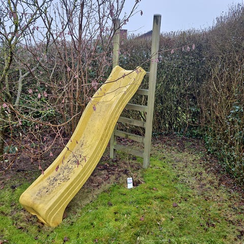 Solid og stabil børnerutsjebane i rød med blå trinstige. Perfekt til både inde- og udendørs brug.