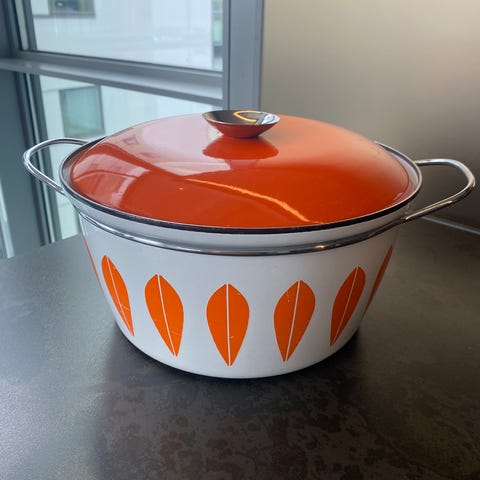 Lotus emaljegryde af Cathrinholm fra Norge. Ydersiden er hvid med grønt bladmønster, og låget er grønt. Gryden har to håndtag i metal og hvid emalje indvendigt. Velegnet som serveringsgryde eller til madlavning på komfuret (også med induktion). Har små ubetydelige brugesmærker men ingen rust. Kan godt afleveres mod 50kr.