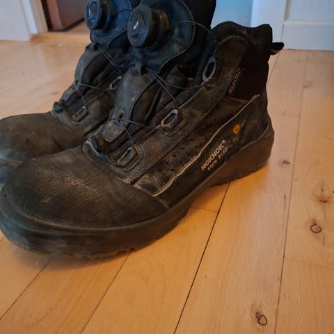 Nokian støvler i størrelse 47 i sort farve. Modellen har lukning med drejespænde og wirer i stedet for traditionelle snørebånd. Overdel og sål er udført i syntetiske materialer med mønstret ydersål for bedre fodfæste. Velegnet som arbejds- eller fritidsfodtøj, hvor der ønskes en robust sko med nem justering af pasformen.