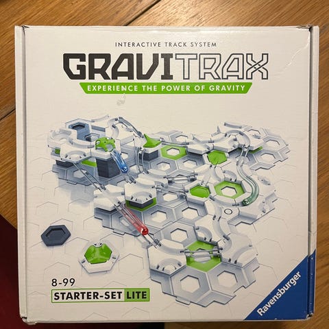 Gravitrax kuglebane byggesæt. Sættene består af modulopbyggede banedele, skinner, søjler og kugler, der kan kombineres på forskellige måder til at bygge kuglebaner. Systemet kan bruges til leg og eksperimenter med fart, tyngdekraft og banedesign. Velegnet som konstruktionslegetøj til børn, der kan lide at bygge og kombinere forskellige dele til egne baner.