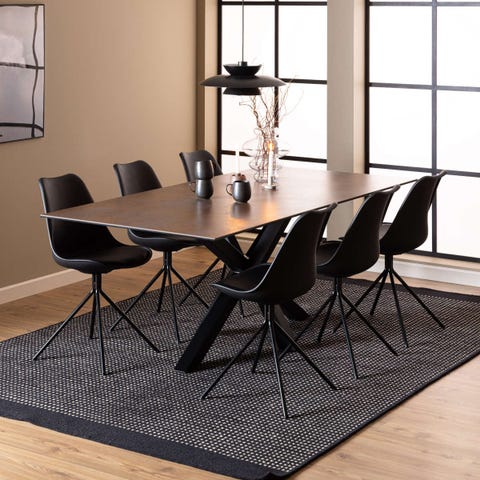 Heaven spise og sofabord fremstår i et stilrent og moderne design. Bordene er udstyret med en robust keramisk bordplade, der er særligt modstandsdygtig over for ridser, varme og pletter. Stellet i sort pulverlakeret stål sikrer både stabilitet og et tidløst look, som passer ind i de fleste indretninger.