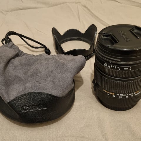 Sigma objektiv 18-125mm, leveres med hama modlysblænde. Front og bagdæksel.