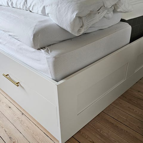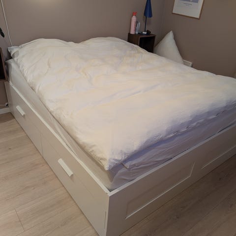 Brimnes sengestel med opbevaring under. Rammen er hvid og har målene 160×200.