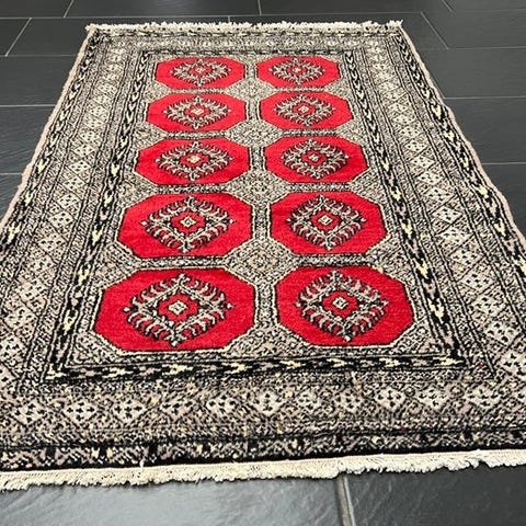 Håndvævet Buchara orientetæppe fra Pakistan, størrelse 185 x 120 cm, uldklæde på bomuldsbasis, fremstillet i slutningen af det 20. århundrede, i generelt god stand med alder- og brugsspor, ægte håndvævet unikt stykke med certifikat af ægthed. Klik på den blå "gå til varen" knap, for at købe eller byde på denne vare. Den samlede pris vil blive vist inden du afgiver dit bud.