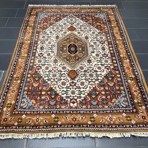 Indisk Bidjar håndknyttet orientalsk tæppe, oprindelsesland Indien, model Bidjar, mål 357 cm × 260 cm, uld på bomuld, generelt i god stand med tegn på alder og slitage. Klik på den blå "gå til varen" knap, for at købe eller byde på denne vare. Den samlede pris vil blive vist inden du afgiver dit bud.