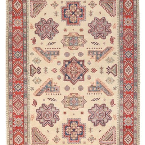 Kazak-tæpper fra Pakistan er håndknyttede tæpper, der oprindeligt blev inspireret af de nomadiske stammer i Kaukasus. De kendetegnes ved deres kraftige farver, geometriske mønstre og traditionelle symbolik. Typiske farver er rød, blå og beige, som opnås med plantebaserede farvestoffer. Tæpperne er fremstillet af høj kvalitet ny uld, hvilket giver dem en robust og holdbar struktur. Kazak-tæpper er populære både på grund af deres æstetiske skønhed og deres holdbarhed.
