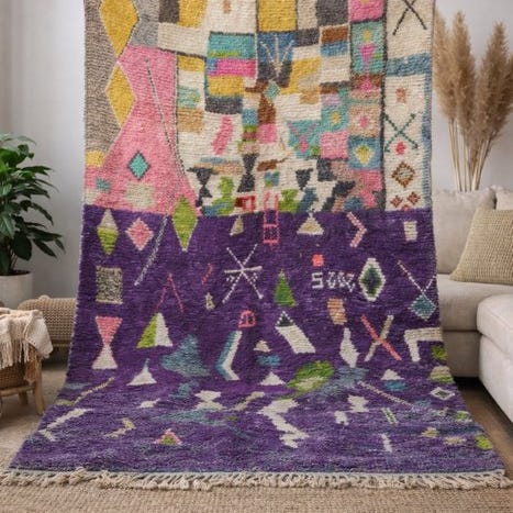 Rigtigt ud af det imponerende Atlasbjergene kommer dette autentiske Berber-tæppe, håndknyttet af fagkvinder der væver deres historier, traditioner og følelser ind i hvert mønster. Ingen masseproduktion, men ren håndværk – tråd for tråd, lavet med kærlighed.