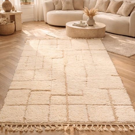 Den bløde cremefarve udstråler varme og passer perfekt til et boho-, moderne- eller luksuriøst interiør. Det subtile geometriske mønster symboliserer livsbaner, beskyttelse og samhørighed – typiske kendetegn ved traditionel Berberkunst. Hvert detalje fortæller en historie.