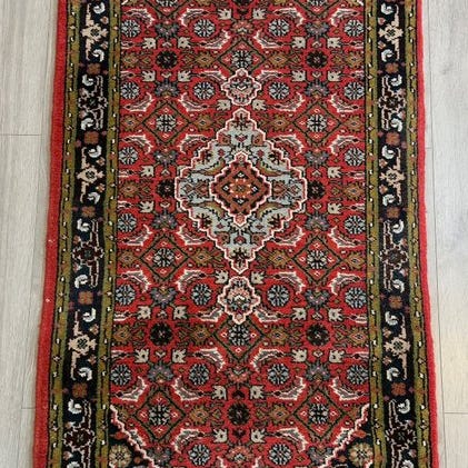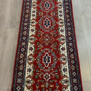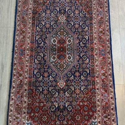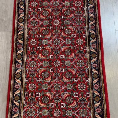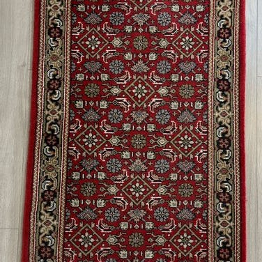 Det rødrøde felt er udstyret med et regelmæssigt, tæt udført rapport af stiliserede blomster- og rankemotiver, der fordeler sig jævnt over hele fladen. Gennem den fine struktur opstår en rolig, elegant fladevirkning. Den mørkt holdte hovedbordüre med florale palmet- og arabeskenmotiver indrammer det indre felt kraftfuldt og skaber en stilfuld kontrast. Farvesammensætningen af rød, marineblå, beige og varme jordfarver virker klassisk,