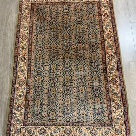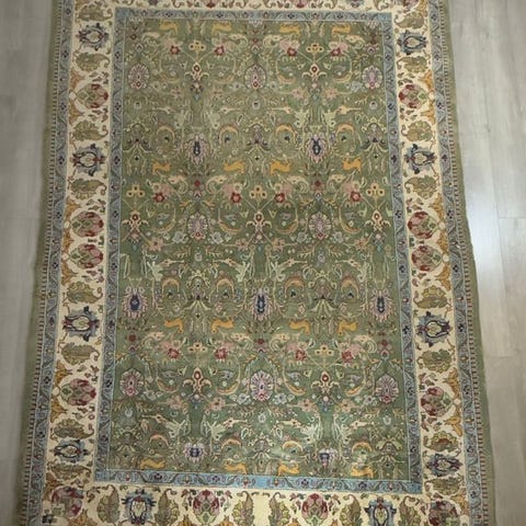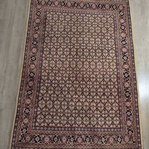 Persisk Täbriz håndknyttet orientalsk tæppe, mål ca. 355 × 250 cm, uld på bomuld, oprindelsesland Indien, fremstillet i slutningen af det 20. århundrede, i god generel stand med alder- og brugsspor. Klik på den blå "gå til varen" knap, for at købe eller byde på denne vare. Den samlede pris vil blive vist inden du afgiver dit bud.