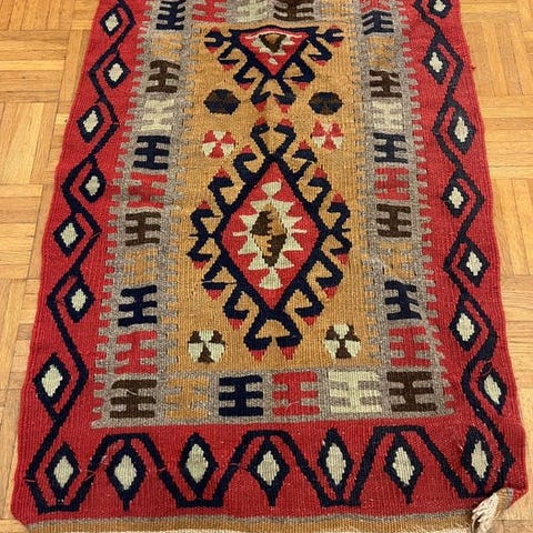 Håndvævet uldtæppe fra Tyrkiet, fra slutningen af det 20. århundrede (ca. 1990), orange, 100 × 175 cm, med inskriptionerne "CUMA" og "BIRDANE", professionelt rengjort og i meget god stand. Klik på den blå "gå til varen" knap, for at købe eller byde på denne vare. Den samlede pris vil blive vist inden du afgiver dit bud.