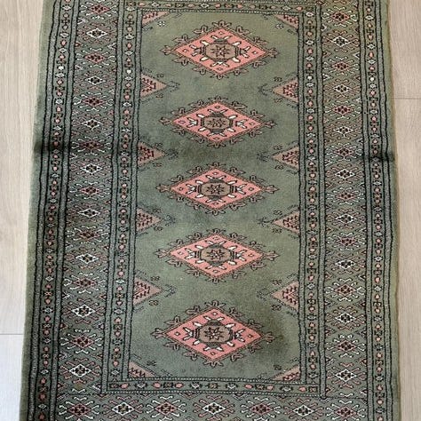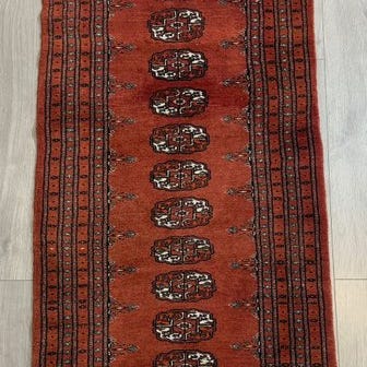 Håndknyttet Bokhara orientteppich fra Pakistan, mål 115 × 82 cm, uld på bomuld, fremstillet i slutningen af det 20. århundrede og i godt stand med alders- og brugsspor. Klik på den blå "gå til varen" knap, for at købe eller byde på denne vare. Den samlede pris vil blive vist inden du afgiver dit bud.