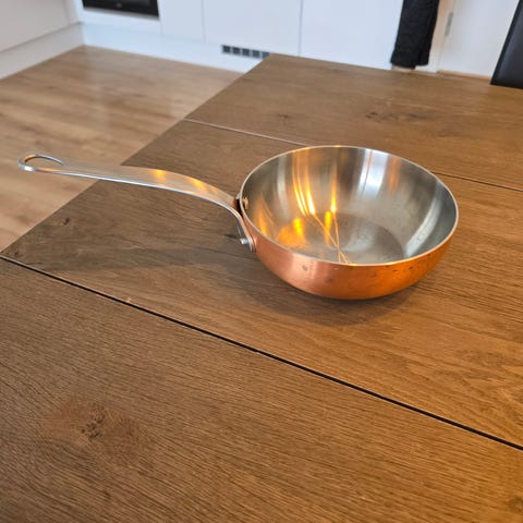 Door brug vil den kobberudvendige del blive misfarvet, hvilket giver panden et rustikt udseende. Hvis du ønsker at genoprette den oprindelige farve og glans, kan du bruge Mauviel Copperbril kobberpolish til at polere kobberet.