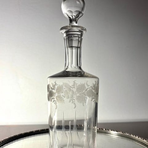 Jeg byder denne pragtfulde vinskaraffel (eller likørkaraffel) i krystal fra mærket Baccarat, fremstillet udelukkende for smykkemageren Christofle. Denne model er udsmykket med et delikat palmettemotiv (Empire/Coquille-stil) skåret med bemærkelsesværdig præcision, og giver smukke lysreflekser.