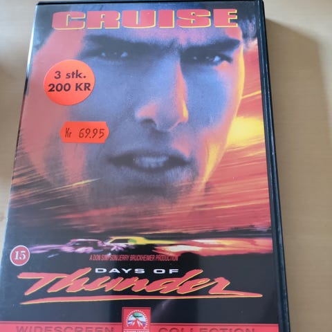 Days of Thunder film på DVD. Widescreen-udgave med aldersmærkning 15+. Actionfilm med racerløb som tema. Egnet til afspilning på standard DVD-afspillere, der understøtter denne region og format.