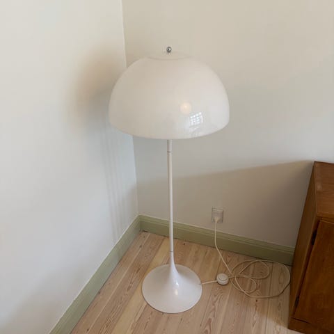 &Tradition gulvlampe i hvid farve. Designet af Verner Panton. Lampen har en rund fod, slank stander og halvkugleformet skærm. Velegnet som belysning i stue, læsehjørne eller soveværelse.