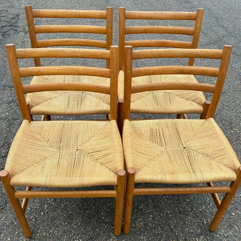 POUL VOLTHER. stole, 6 stk, sæde af eg & flet, Møbelmagere Danmark, anden halvdel af det 20. århundrede. Mærket Danske Møbelmagere, formentlig fra Frem Røjle.
