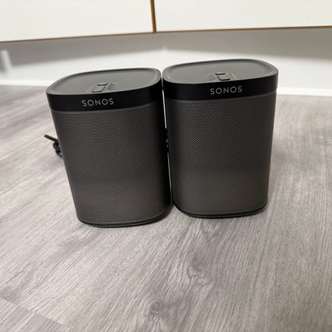 Kompakte trådløse højttalere til brug med Sonos-systemet via netværk. På billederne ses flere enheder med tilhørende strømkabler og vægmonteringsbeslag. Velegnet til brug som enkeltstående højttalere, i stereo-par eller som surroundhøjttalere i et eksisterende Sonos-setup.
