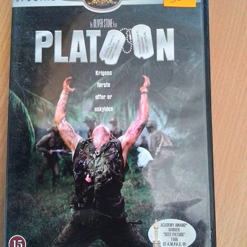 Platoon Special Edition DVD film. Udgave af krigsfilmen Platoon i special edition-version på DVD. Forsiden viser originalt filmcover. Aldersgrænse 15 år ifølge mærkning på coveret. Velegnet til afspilning på standard DVD-afspillere, der understøtter dette format.