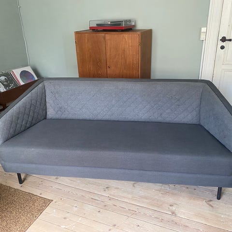 En tidligere klassiker og 3 personers sofa fra Sofacompany - i mørk lilla og med træ-ben.