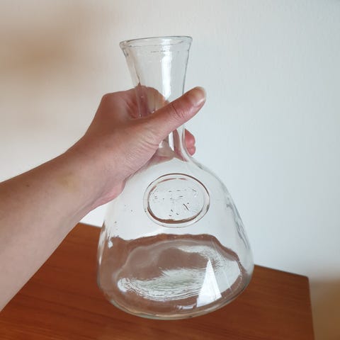 Jeg har til salg en vinkaraffel i glas i enkel stil, som har mål på halsen til 1/4 liter. Karaflen er i en stil, som det kendes fra vinbondens bord i Frankrig eller Italien, enkel og rustik. Størrelsesforholdet kan ses ved at sammenligne med lighteren på billede nr. 3. Karaflen er helt intakt og uden nogen form for skår eller afslag.