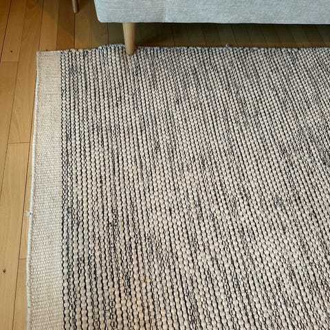 Rugvista tæppe i grålige nuancer med grafiske nuancer.
