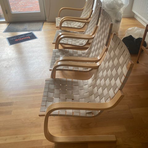 Artek lænestol med armlæn og fletsæde i lyst naturfarvet bånd. Stel i lyst træ med buede ben og armlæn. Stolen er egnet som loungestol eller læsestol i stue, soveværelse eller andre opholdsrum. Design af Alvar Aalto.