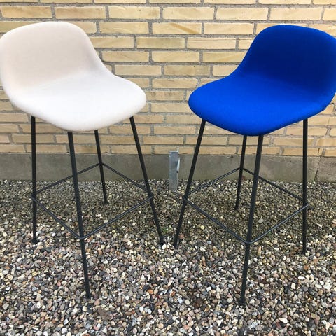 Muubs barbord med 2 tilhørende barstole. Sættet består af et rundt barbord og to barstole med sæder i mørkt træ og stel i sort metal. Bordet har en rund bordplade og en centralt placeret søjlefod i metal med rund base. Barstolene har rund træsæde og slankt metalstel med fodstøtte. Egnet til brug i køkken, alrum eller mindre spiseområder, hvor der ønskes en høj siddeplads ved et kompakt bord.