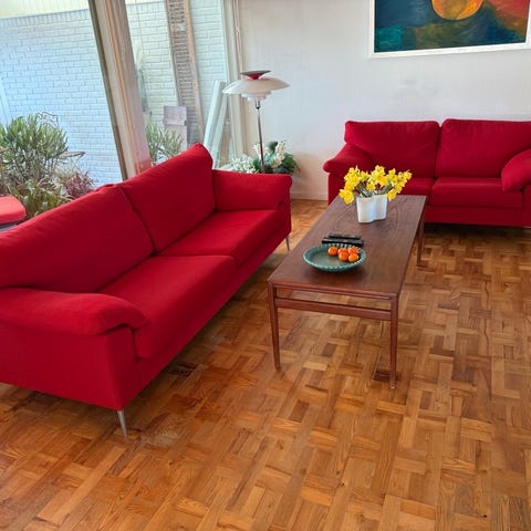 RIGTIG FLOTTE RØDE ULD SOFAER 3 PERS OG 2 PERS I RØDT ULD STOF . STÅET I ET HJEM UDEN RØG .