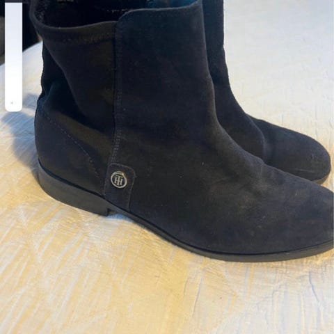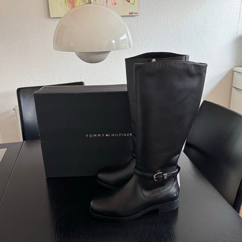 Tommy Hilfiger støvler i størrelse 37. Støvlerne er sorte med kraftig blokhæl og spids snude. De har dekorativ rem over vristen med metaløjer og spænde. Ydersålen har præget Tommy Hilfiger-logo. Velegnet til hverdagsbrug og mere formelle anledninger.