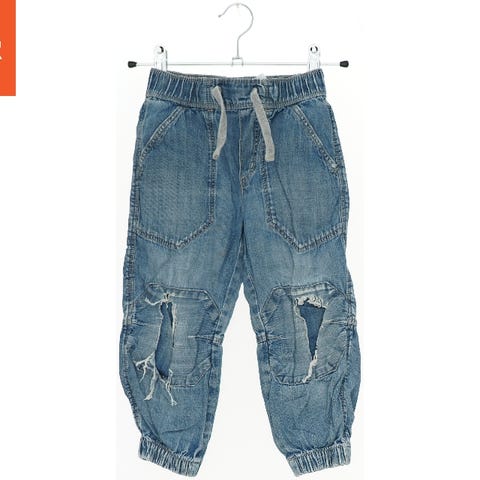 Et par blå jeans til børn med almindelig pasform. De har to lommer foran og to baglommer. Bukserne er lavet i denim stof og har en knaplukning foran.
