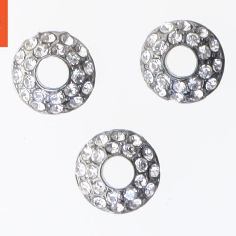 Billedet viser en samling af smykkestykker og perler i forskellige former og størrelser. Perlerne varierer i materialer, med nogle ser ud til at være lavet af metal med rhinsten indlagt, og andre af mindre, sortfarvede perler. Der er både runde og møntlignende smykkestykker, hvor nogle har krystaller eller sten som dekoration. Perfekt til at skabe eller reparere smykker som halskæder, armbånd eller ørestikker.