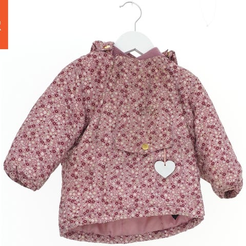 Vatteret jakke i lilla farve. Jakken har et gennemgående hjerte-design med syning, hvilket giver et tekstureret udseende. Forsiden af jakken har et lynlås og to lommer. Der er et gråt hjerte detalje foran og bagpå. Ærmerne har ribkant og en refleksstribe.