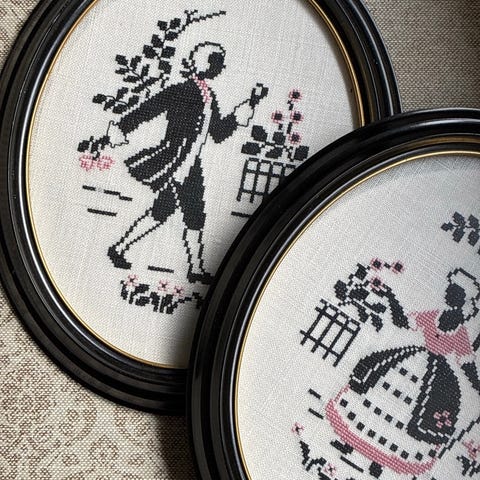 Dette er et sæt af fire ovale opspændings rammer i rødt med antikke metaløskner til brodering. Størrelserne på billederammerne er 15,5 cm, 12 cm og 10 cm.