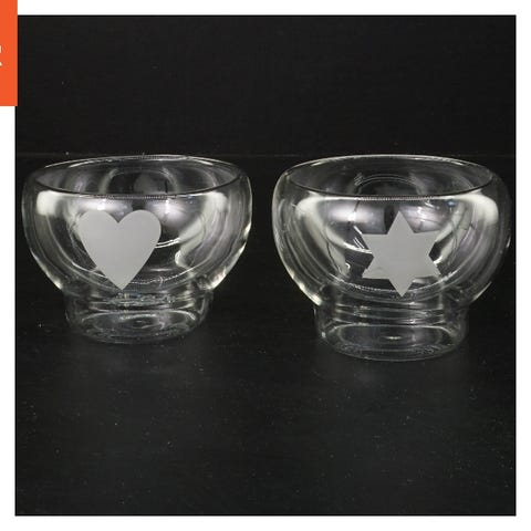 Denne vare består af to glasskåle med et blomstermønster. Skålene har en klar tekstur og et dekorativt design, ideelt som en del af bordindretning eller til servering af små snacks. Deres størrelse er 13,5 cm i diameter og de har en unik udformning, der minder om blomsterblade.