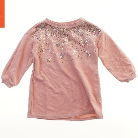 Bluse med lange ærmer i rosa farve. Den er dekoreret med et eventyrtema, der inkluderer figurer som en enhjørning, svampe og skovmotiver. Blusen har små flæsede detaljer på skuldrene og er lavet af blødt materiale.