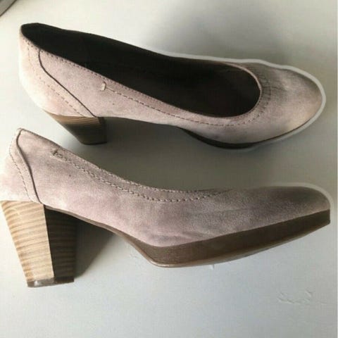 Damesko i størrelse 39 med en kombination af ruskind og laklæder. Skoen er beige med en sort lak detalje ved tåspidsen og en dekorativ bue. Den har en medium hæl højde og sål lavet af gummi. Indersiden af skoen er foret og har en behagelig polstring.