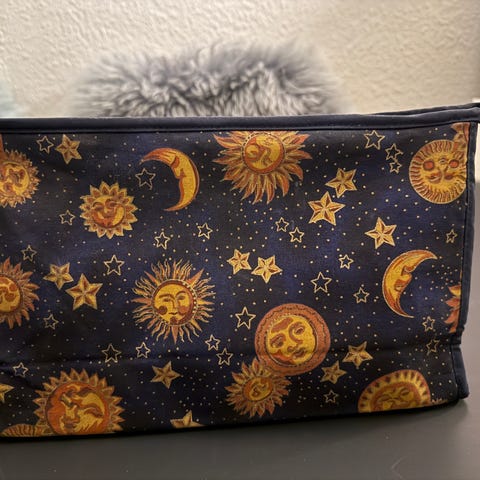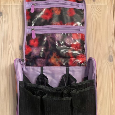 Toilettaske i blå polyester med lynlåse. Tasken har flere rum og lommer, hvilket gør den velegnet til organisering af toiletartikler. Tasken måler 31x24 cm og kan bæres eller hænges op ved hjælp af den øverste loophåndtag.