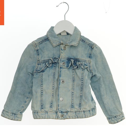 En klassisk lyseblå denim jakke med lange ærmer og knaplukning foran. Jakken har to brystlommer med klap og knapdetaljer. Bagsiden af jakken er enkel uden yderligere dekorationer.