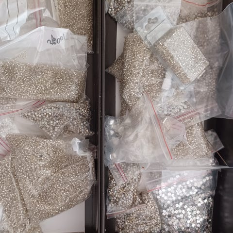 Perler: poser med assorterede perler, herunder ivory-farvede perler (3mm), glasperler og similisten.