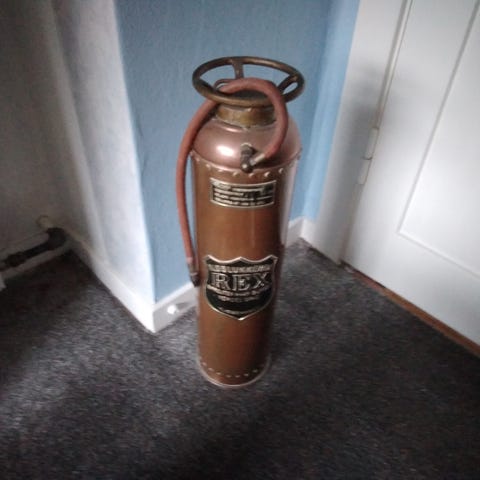 Ginge brandslukker i brunlakeret metal. Klassisk cylindrisk model med håndtag og ventil i metal samt dyse i toppen. Ældre type, egnet som teknisk genstand eller dekoration. Tekstplade på siden og præget tekst på ventilknappen med angivelse af brug ved brand.