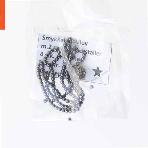Smykket består af en kæde med perler og flere dekorative vedhæng, inklusive blomster og krystal. Kæden er primært grå med nogle gyldne elementer og vedhængene har flere detaljer, der giver smykket et unikt udseende. Det kommer i en plastpose.