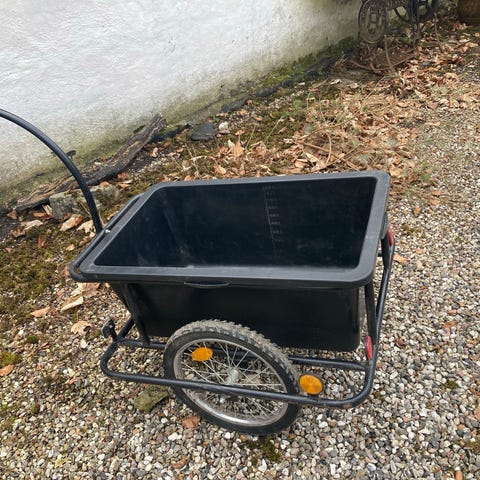 Trækvogn trailer med rektangulær plastkasse og to hjul. Kassen er sort plast, og hjulene har gule fælge. Vognen har trækstang med håndtag og metalbeslag til montering eller fastgørelse. Egnet til transport af mindre gods, indkøb eller udstyr, f.eks. bag cykel eller til gåture, afhængigt af montering og kompatibilitet.