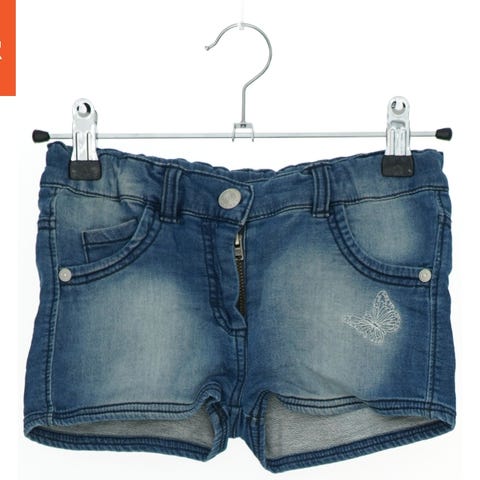 Denim shorts i blå farve til børn med to forlommer, to baglommer og en knaplukning foran. Der er et broderet sommerfuglemotiv på den ene forside.