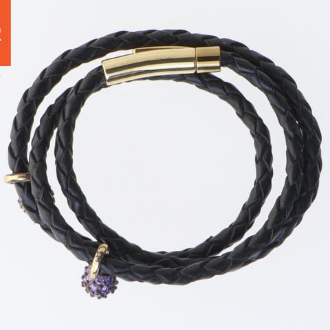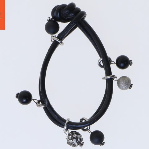 Dette er et stilfuldt armbånd lavet af sort lædersnor, der går rundt flere gange. Armbåndet er dekoreret med tre skinnende kugler, hver dækket af små sten, der giver et elegant look. Længden af armbåndet er 51 cm, og det har en magnetisk lukning i guldmetallik. Perfekt til at tilføje et strejf af glans til ethvert outfit.