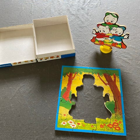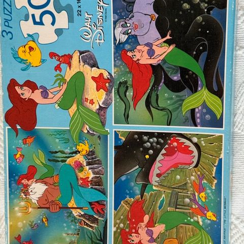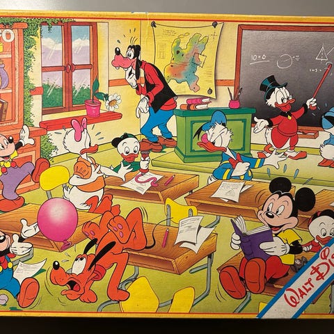 Walt Disney puslespil, puslespil, Jumbo Puzzle med 101 Dalmatinere og King Puzzle med Fedtmule, Mickey Mouse, Daffy Duck, Pelle Gris, Store Stygge Ulv, De tre små grise, Rip, Rap og Rup samt Anders And. Pris pr stk.