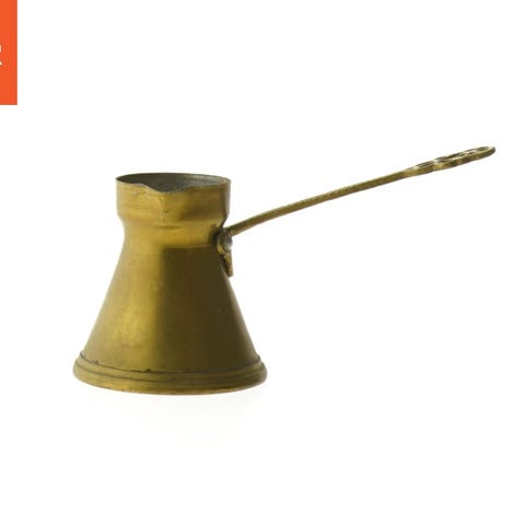 Antik messingtekande med træhåndtag og lågknop. Har rund krop og buet tud.